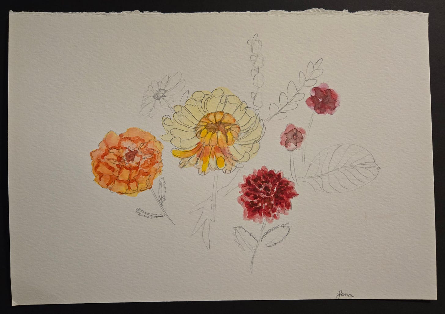 A few months ago I sat in on a virtual online class through the Tucson Botanical Garden1 for a “Fall Flowers” workshop. There was a lot of good info, but I didn’t have enough time during the session to finish the sketch. Here is my work in progress: