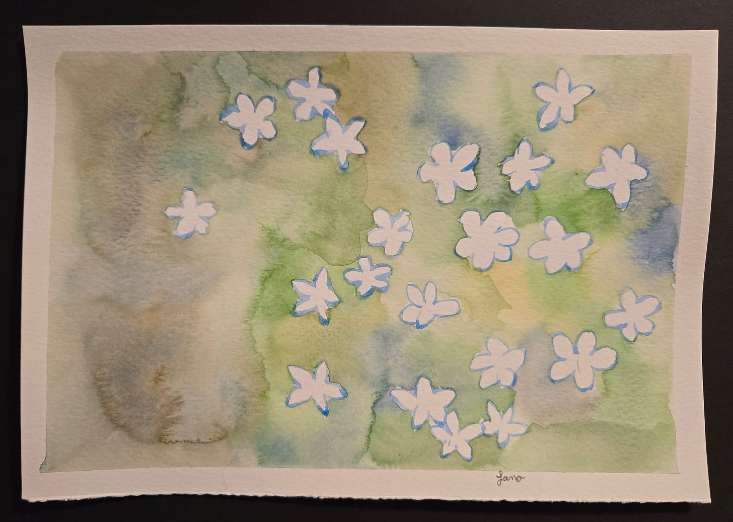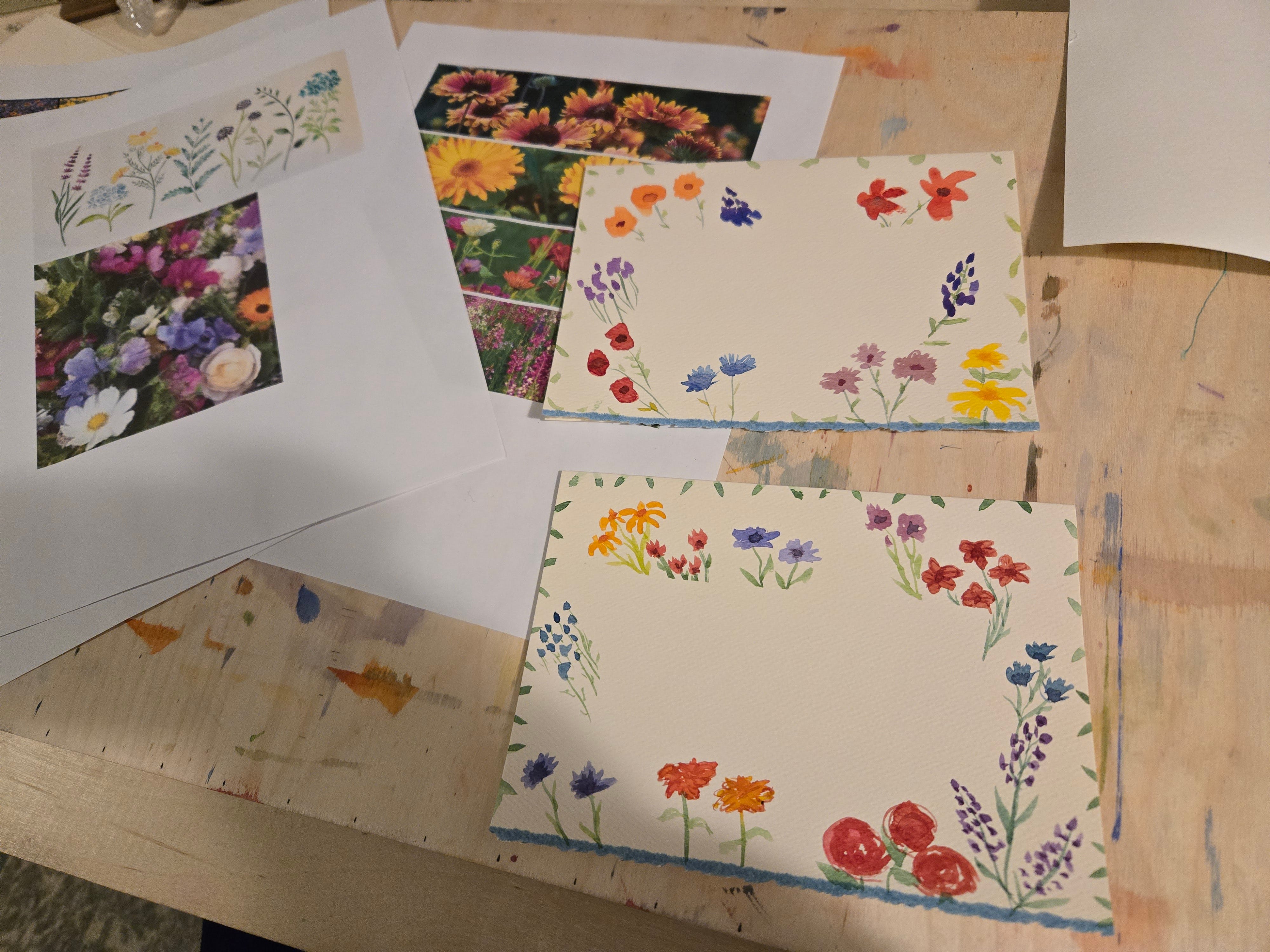 To execute this, I printed some reference images of wildflowers that I found around the web. I painted directly onto a pre-folded Strathmore watercolor paper card that I purchased at a craft thrift shop.