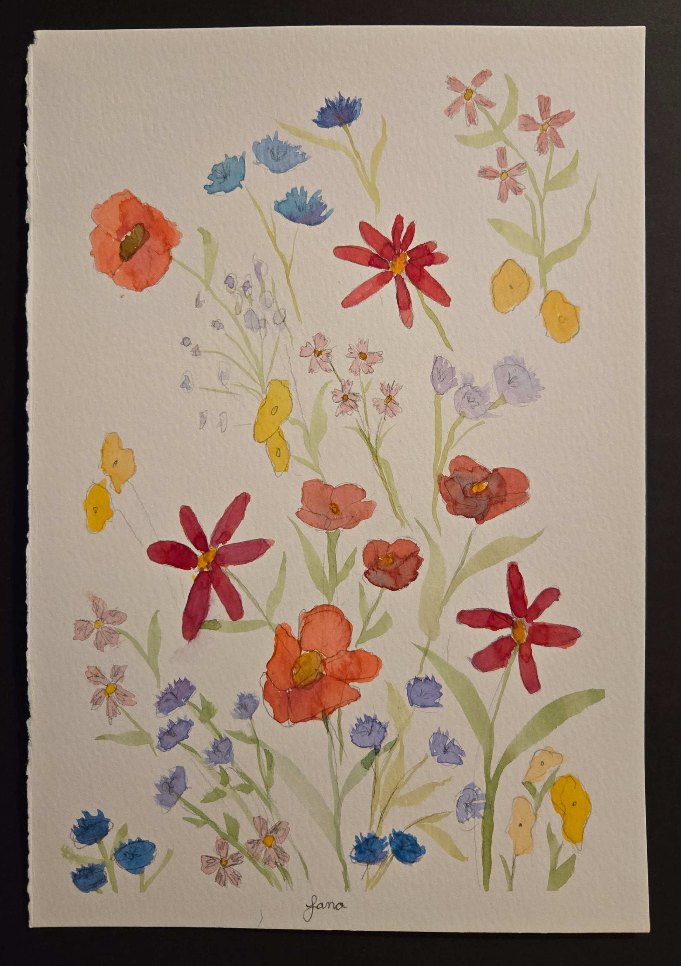 I taped a box in the middle and free-hand painted small blobs around the border, starting with colorful petals, then adding the interiors and last adding the stems and leaves. I mostly used round brushes size 3, 4, and 5 - a bit smaller than my usual paintings.2